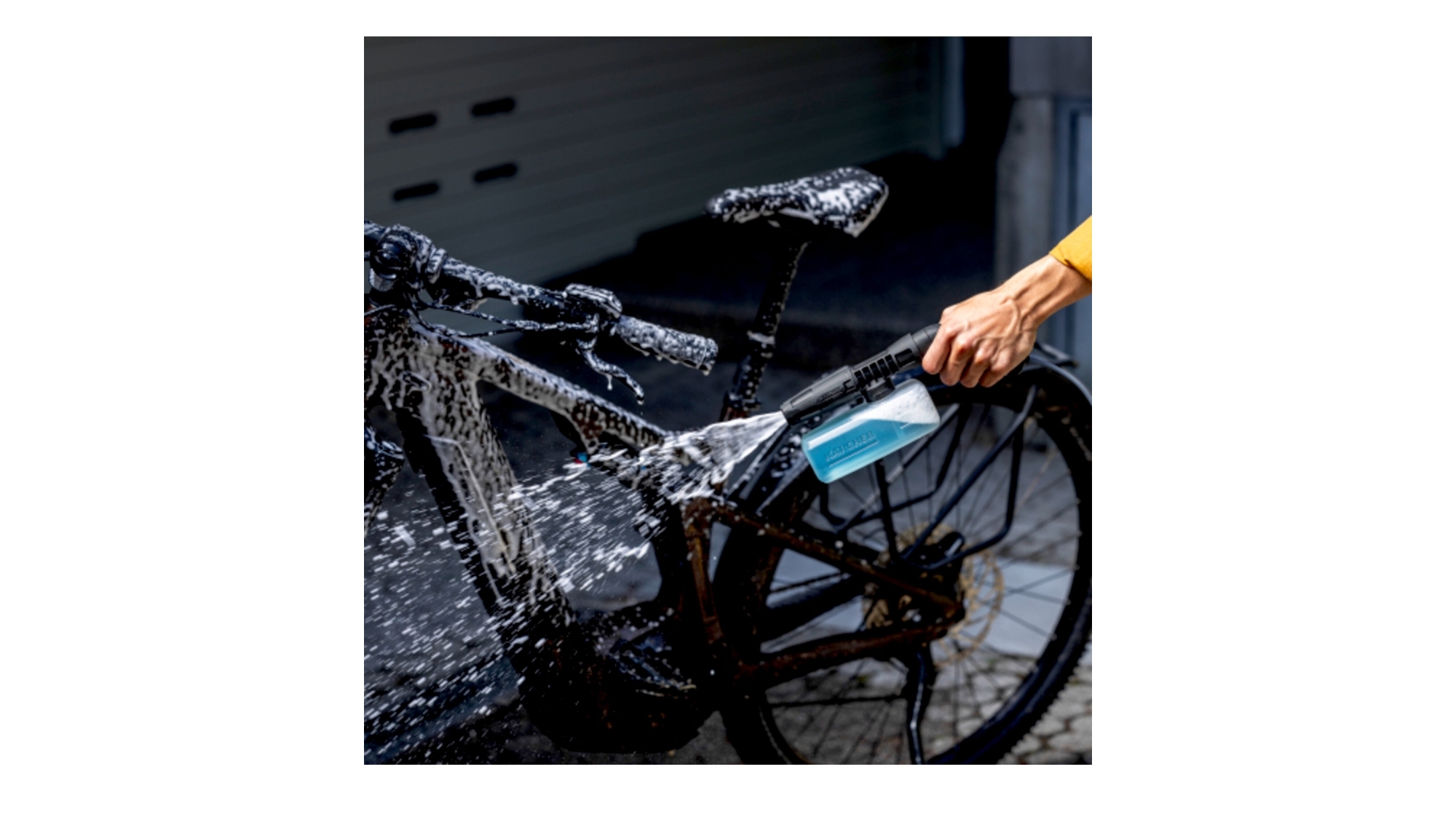 Le canon se clipse directement sur le pistolet du nettoyeur mobile : il suffit de verser le produit dans le réservoir transparent (env. 0,35 L), de régler l’angle de jet, et de pulvériser. La mousse couvre facilement les formes complexes et atteint les zones difficiles d’accès, idéal pour les vélos, mobilier de jardin, équipements de camping, poussettes, etc.